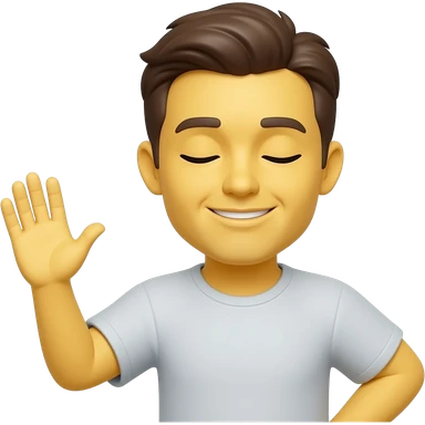 Uncertain shrug emoji, yellow face, closed eyes, slight smile, one hand raised palm up, glossy 3D emoji style emoji