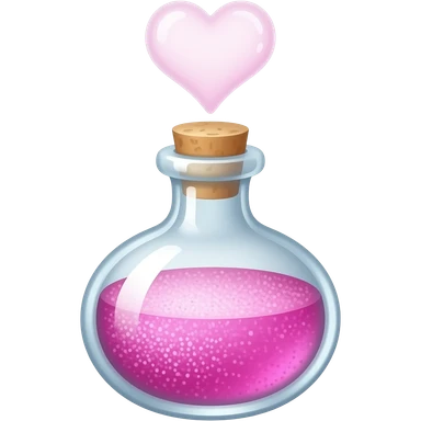 small glass potion bottle, pink shimmering liquid with soft glow and heart-like steam, elegant shape, centered, 3D glossy emoji style, clean background emoji