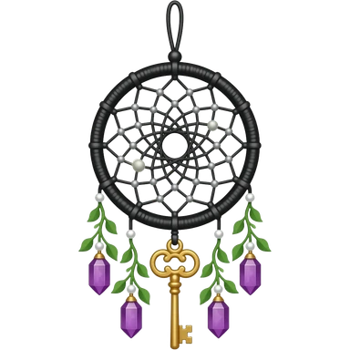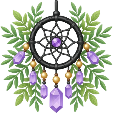 Black and white dreamcatcher with amethyst crystals, gold pearls, and green plants emoji
