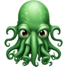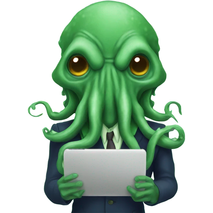 deep green Cthulhu with purple bat wings and purple gradient tentacles. Yellow angry eyes. yellow suckers on tentacles. dramatic ominous shading. two saber-teeth emoji