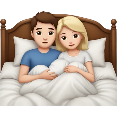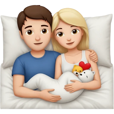 cuddling in bed, asleep. blonde girl. brunette boy. eyes closed. heart between them. emoji