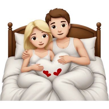 cuddling in bed, asleep. blonde girl. brunette man. eyes closed. heart between them. emoji