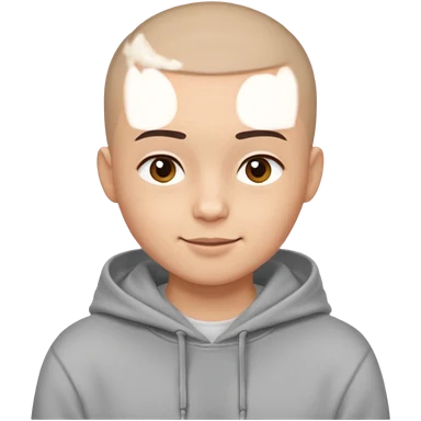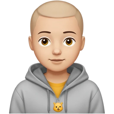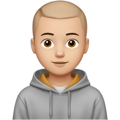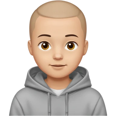Light skin tone Buzz cut (very short hair) Thick, straight eyebrows Big round brown eyes Small closed-mouth smile Wearing a grey hoodie over a white T-shirt emoji
