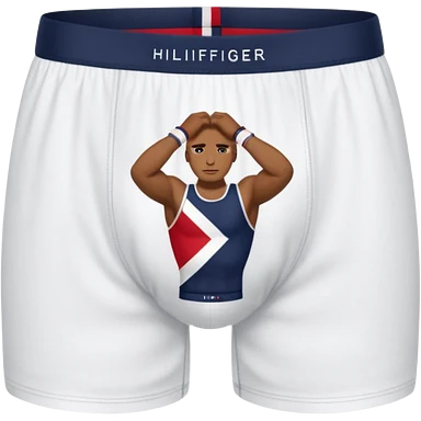 rapaz de cabelo escuro dormindo de lado, de corpo inteiro usando camiseta branca e cueca cinza claro emoji