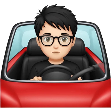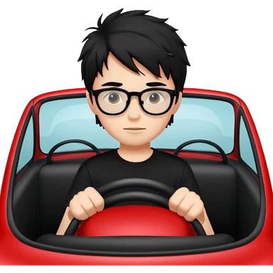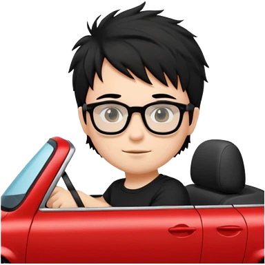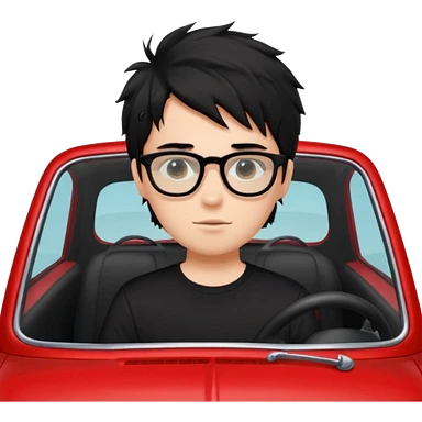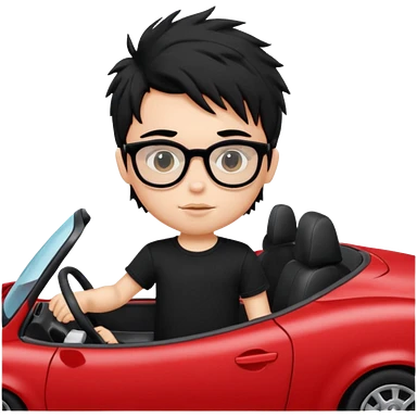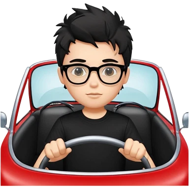 generate a pretty bratz fair skinned boy with black messy hair wearing a black tshirt driving a red car. Glasses on. emoji
