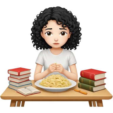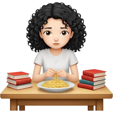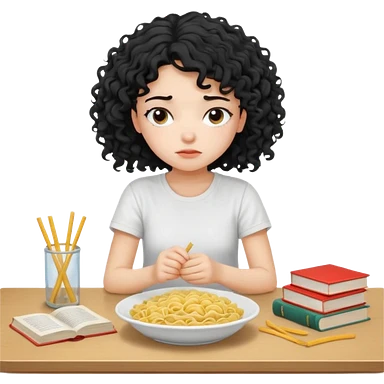 generate a pretty bratz fair skinned girl with curly black hair wearing a white tshirt sitting on a table with noodles and books. looking sleepy and tired and sad emoji