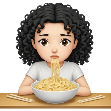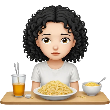 generate a pretty bratz fair skinned girl with curly black hair wearing a white tshirt sitting on a table with noodles. looking sleepy and tired emoji