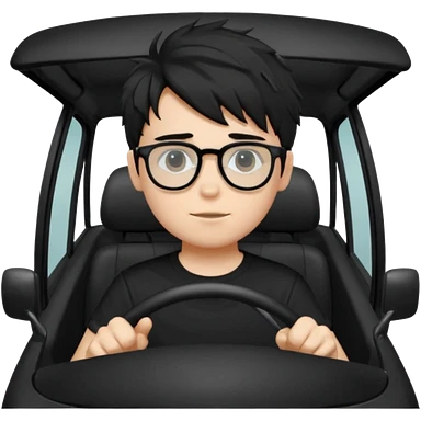 generate a pretty bratz fair skinned boy with black messy hair wearing a black tshirt driving. Glasses on. emoji