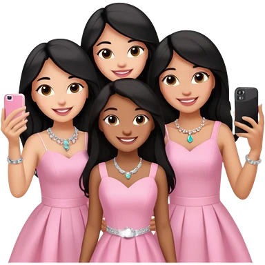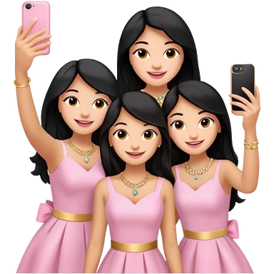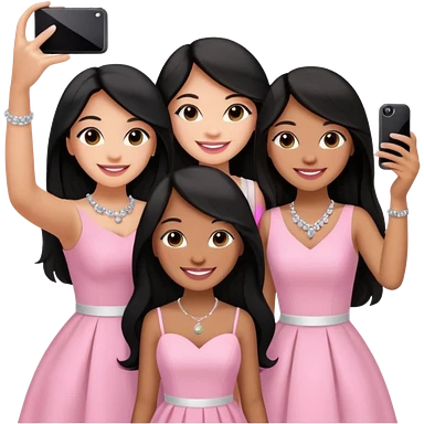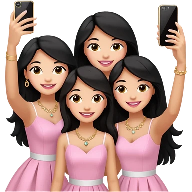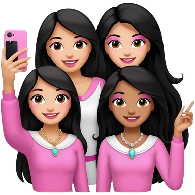 Just 3 besties with professional glammed up looks wearing pink and white, medium skin tone smiling big with black long hair. Very girly wearing jewelry, taking a selfie emoji