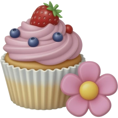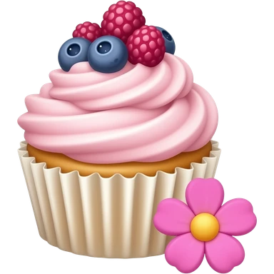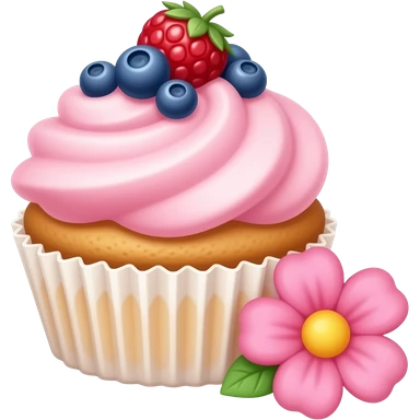 cupcake with pink icing and berries on itwith a cute pink flower next to it emoji