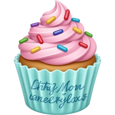 Cupcake with pink icing add some sprinkle on top and a cyan cover that has a heart calligraphy print on emoji