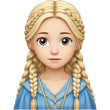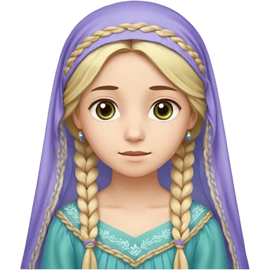 mujer, Joven, de aspecto dulce y elegante. Piel clara, ojos grandes y expresivos (pueden ser azules o verdes), sonrisa triste. Rubio o castaño claro, largo, con trenzas o velo. Vestido largo de tonos suaves (blanco, azul o lavanda), con bordados dorados; un manto o toca fina cubriendo la cabeza. emoji