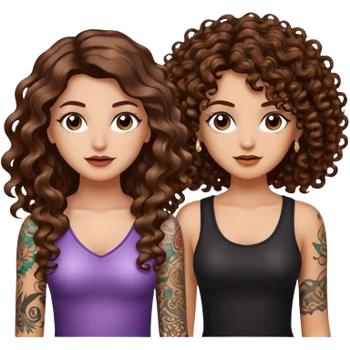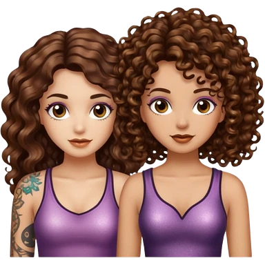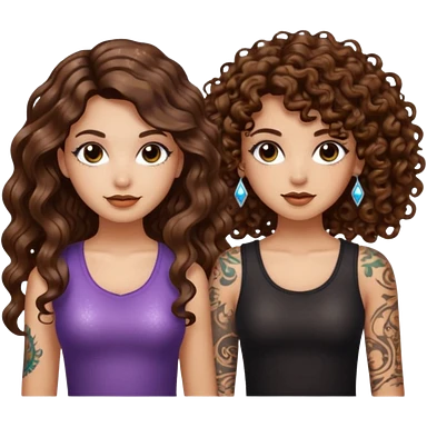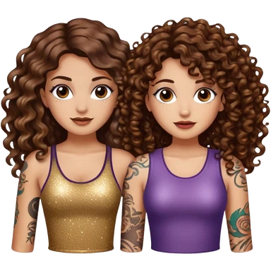 glitter blast — long wavy brown hair tattooed woman and short tight curly brown hair woman — sparkle covered emoji