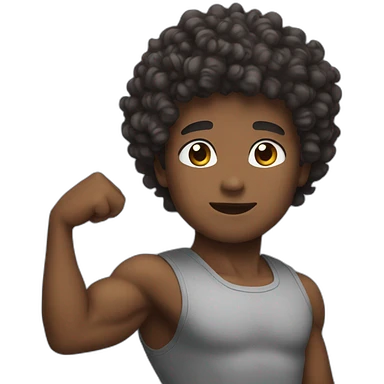 muscular bicep flexing, tight black curly hair, sandy brown skin, thin stash and beard. emoji