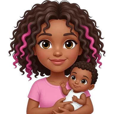 Curly hair with pink highlights, woman with brown skin holding baby with light brown skin straight hair, big eyes emoji | AI Emoji Generator