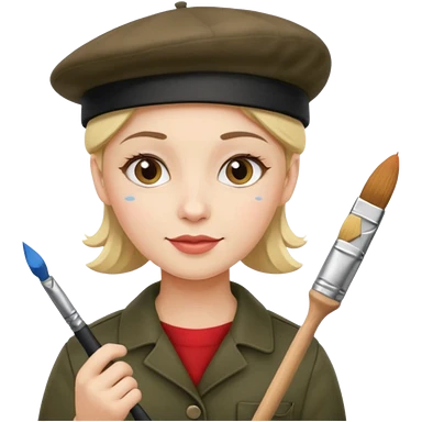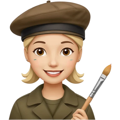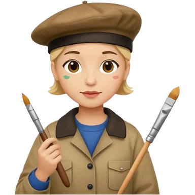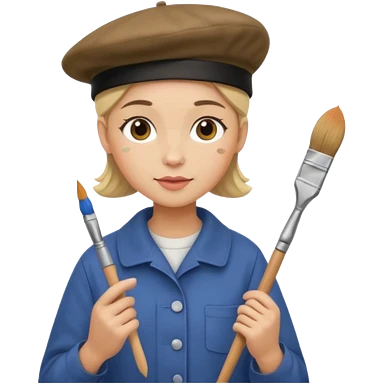 Curly-haired brunette girl painter in artist's costume and paint stains on her pink overalls with a brush and a paint palette in her hand emoji | AI Emoji Generator