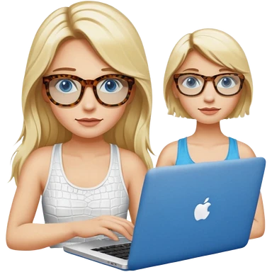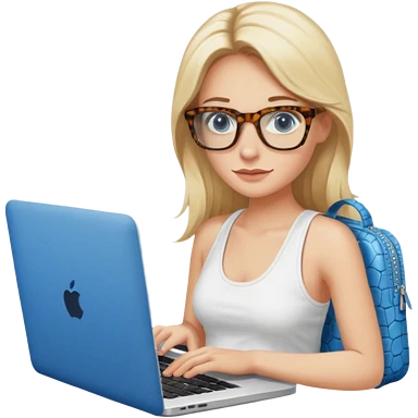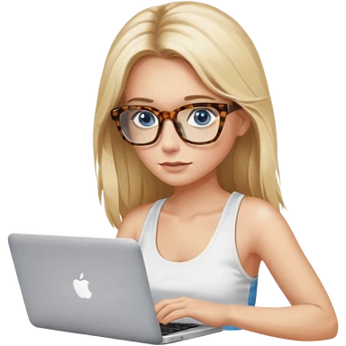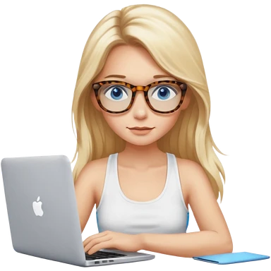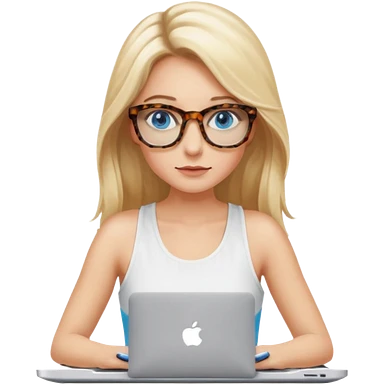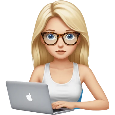 long blonde hair woman blue eyes with tortoise shell print glasses wearing white tank top on mac book emoji
