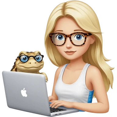 long blonde hair woman blue eyes with tortoise shell print glasses wearing white tank top on mac book with a white crocodile patterns laptop case emoji