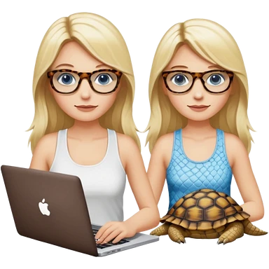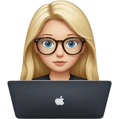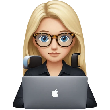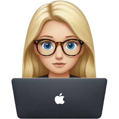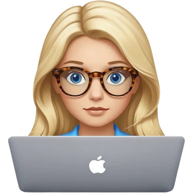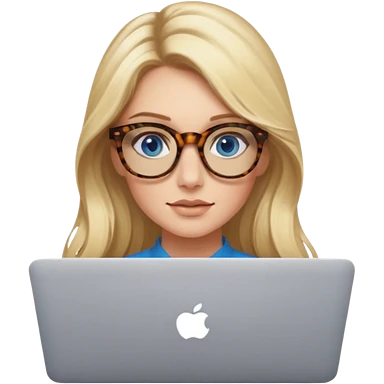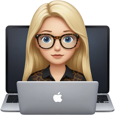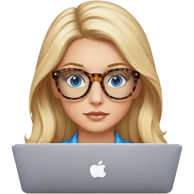 long blonde hair woman blue eyes on mac lap top with tortoise shell print glasses with black shirt emoji