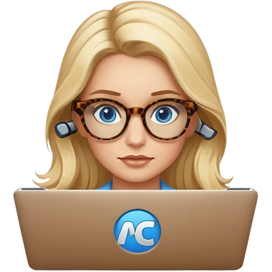 long blown out blonde hair woman blue eyes with tortoise shell print glasses on mac book emoji