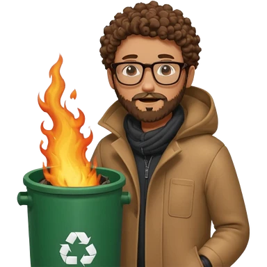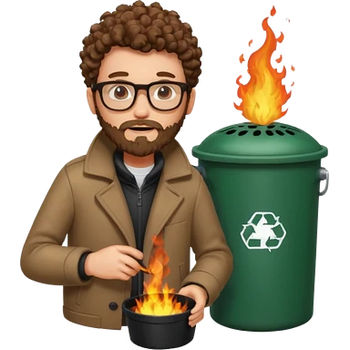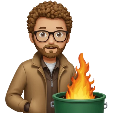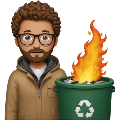 curly skinny guy with bear and glasses, heating in front of a trash bin on fire emoji
