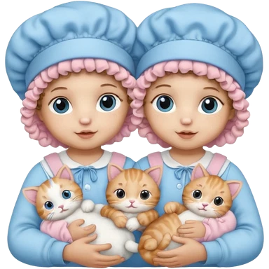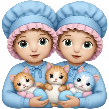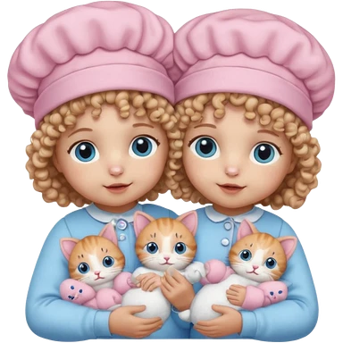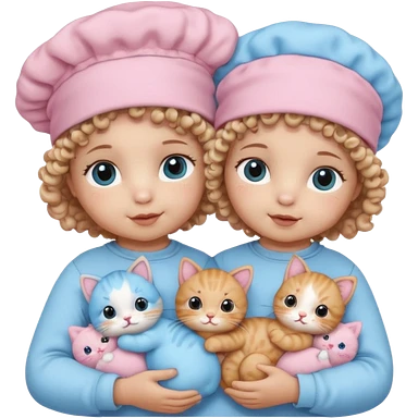 Curly hair baby twins with one wearing a baby pink bonnet and one wearing a baby blue bonnet while holding cat plushies emoji