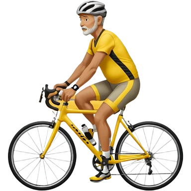 60-year-old man, about 225 lbs, in loose cycling clothes, yellow and black top, straddling grey road bike, graphic design with background as a road with trees emoji