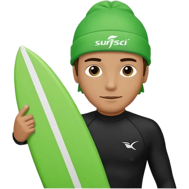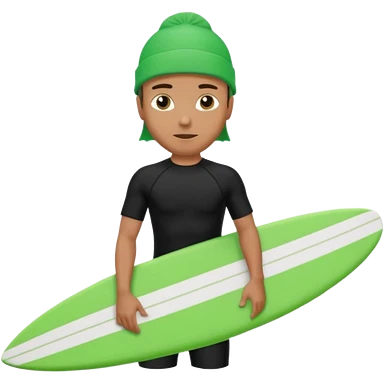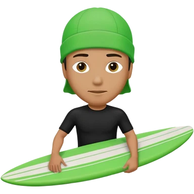 Un hombre sorteando con camisa negra con gorra para nadar y tabla verde emoji