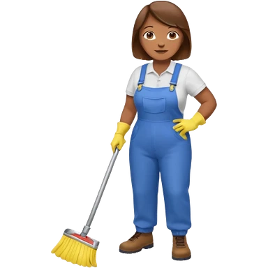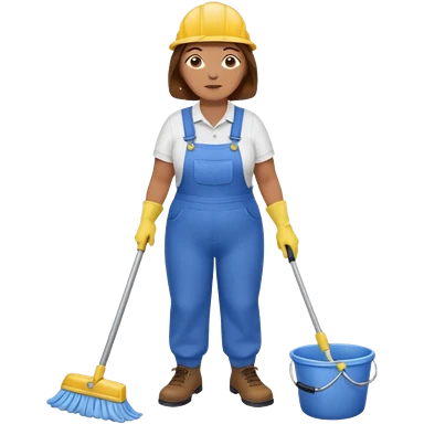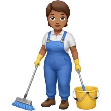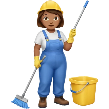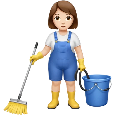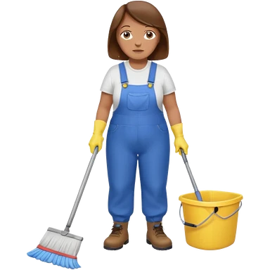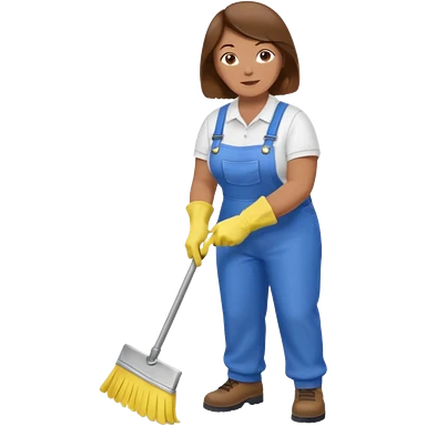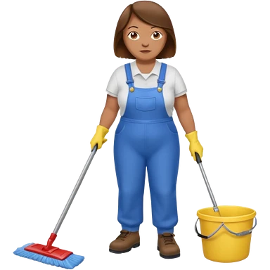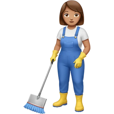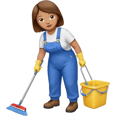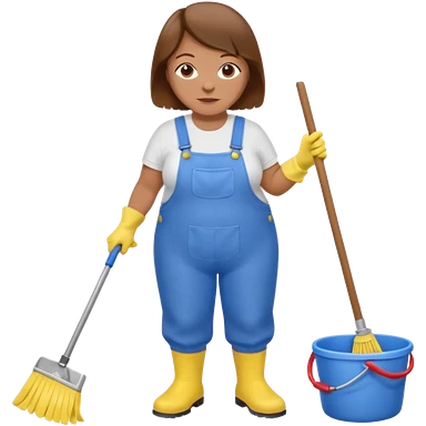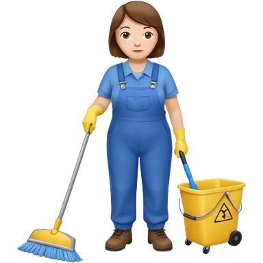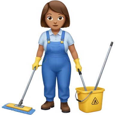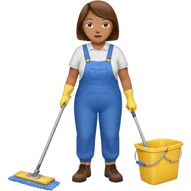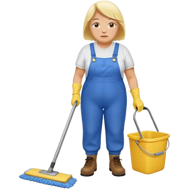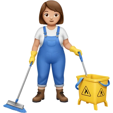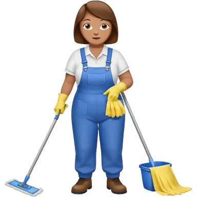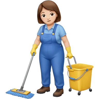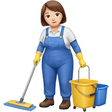 old and fat women, brown hair, Custodian with yellow rubber gloves, white T-shirt, blue overalls, mopping floor emoji