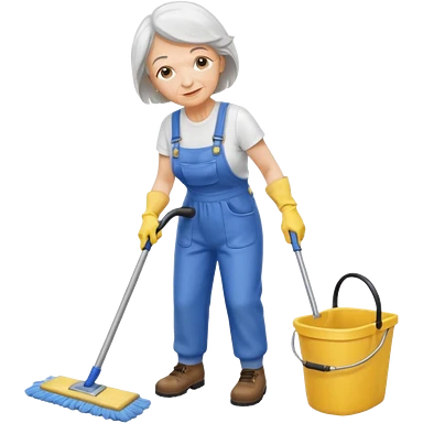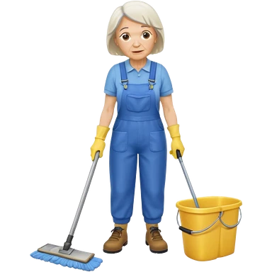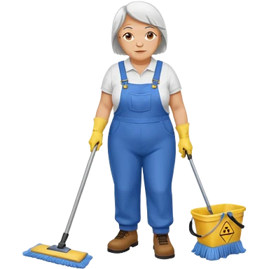 old and fat women, Custodian with yellow rubber gloves, white T-shirt, blue overalls, mopping floor emoji