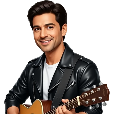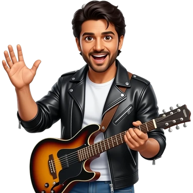 Create a cut-out style emoji of Shah Rukh Khan from Dilwale Dulhania Le Jayenge. He is wearing a black leather jacket over a white T-shirt and holding a guitar.The emoji should have expressive facial features and dynamic hand/pose expression, matching the style of srk emoji
