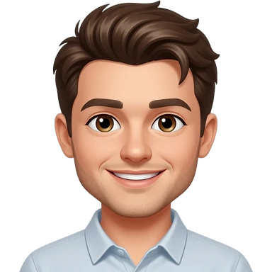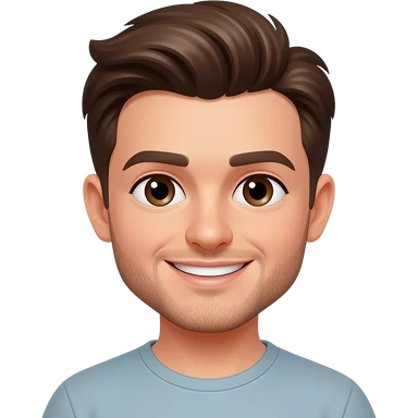 Cute guy with brown hair and brown eyes and dark five o clock shadow smiling, hair parted to the right side emoji