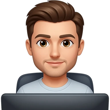 Cute guy with brown hair and brown eyes and light facial hair with hair parted to the right side at computer emoji