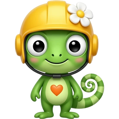cute green chameleon mascot emoji, big round eyes, smiling, wearing a yellow helmet with a white flower on top, small orange heart on belly, simple clean vector style, soft shading, bold outline, centered, minimal background, sticker emoji style emoji