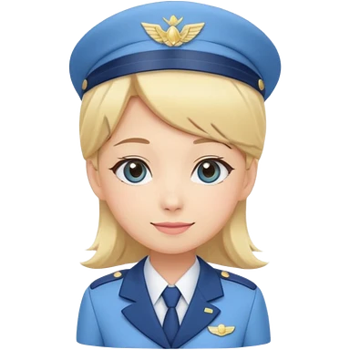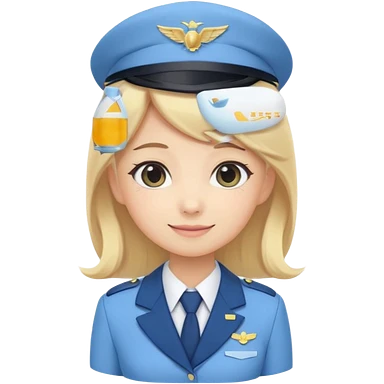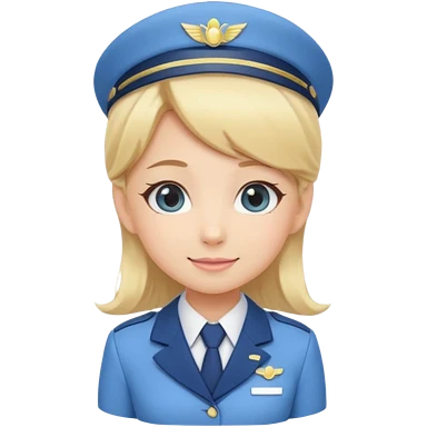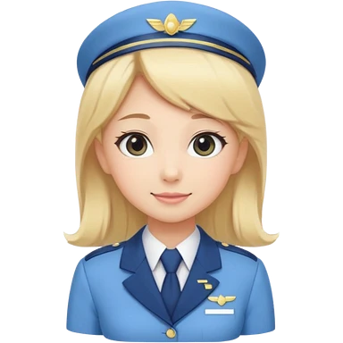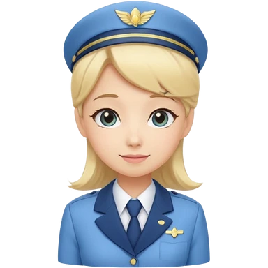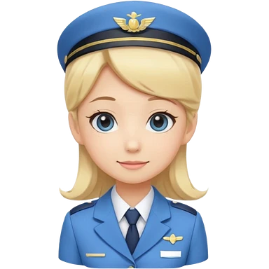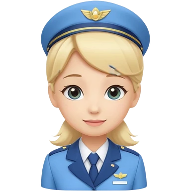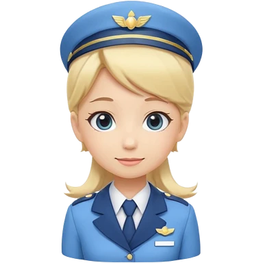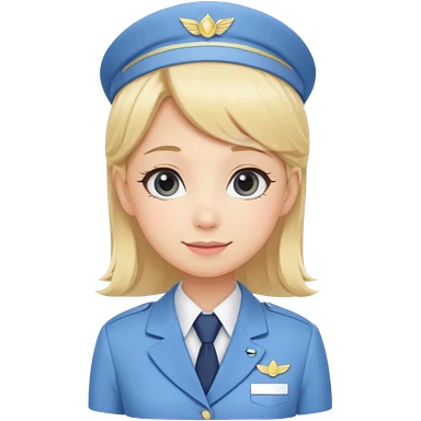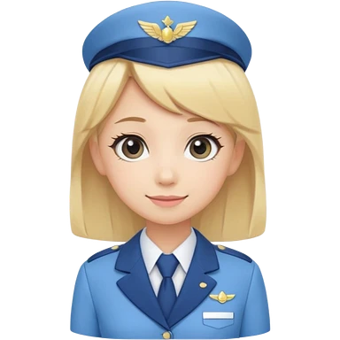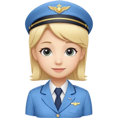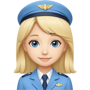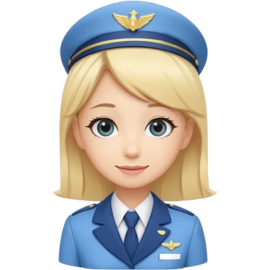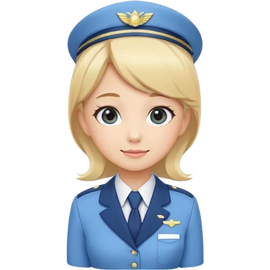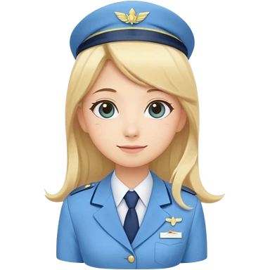 Cute emoji-style Japanese flight attendant, blonde long hair , pastel blue airline uniform, kawaii cartoon style, big eyes, simple clean lineart, pastel colors, chibi proportions, friendly smile, sticker/emoji, transparent background emoji