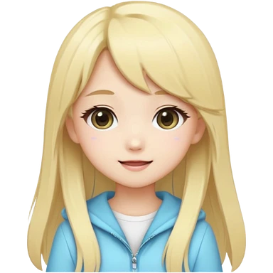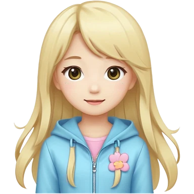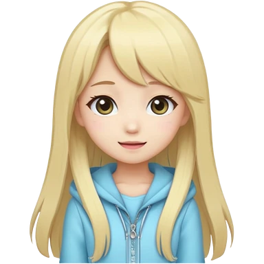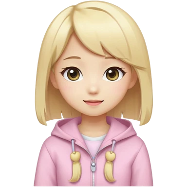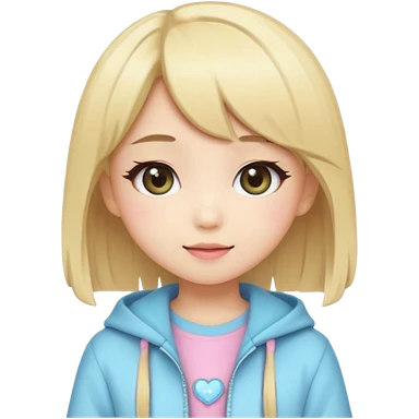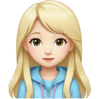 Cute kawaii emoji-style Japanese K-pop girl, blonde long hair , trendy K-pop outfit with Japanese cute fashion vibes, big sparkling eyes, chibi proportions, clean lineart, pastel colors, cheerful idol smile, sticker/emoji style, transparent background emoji