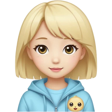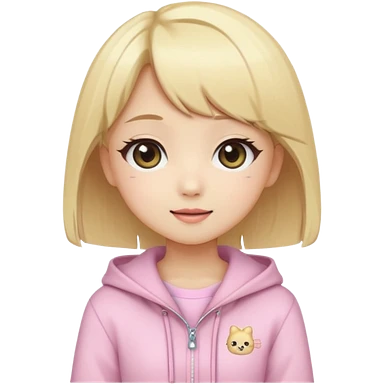 Cute kawaii emoji-style Japanese K-pop girl, blonde hair, trendy K-pop outfit with Japanese cute fashion vibes, big sparkling eyes, chibi proportions, clean lineart, pastel colors, cheerful idol smile, sticker/emoji style, transparent background emoji