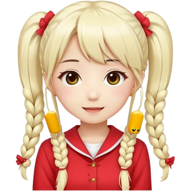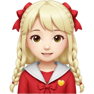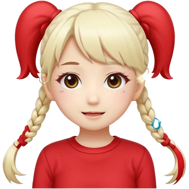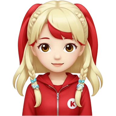 Cute kawaii emoji-style Japanese K-pop girl, long platinum blonde hair in twin tails, red outfit, Japanese K-pop idol vibes, big sparkling eyes, chibi proportions, clean lineart, pastel colors, cheerful idol smile, sticker/emoji style, transparent background emoji