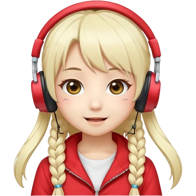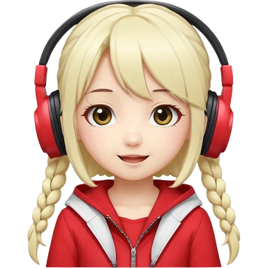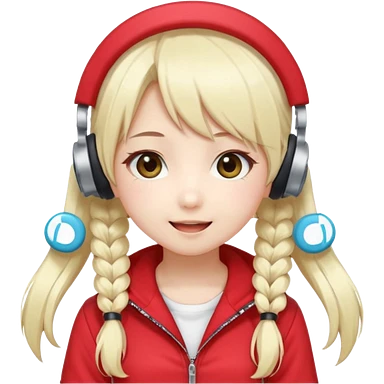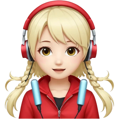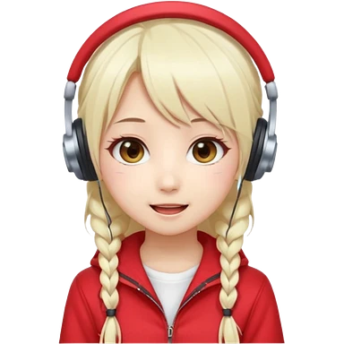 Cute kawaii emoji-style Japanese K-pop singer girl, long platinum blonde hair in twin tails, red outfit, headset mic on cheek, Japanese K-pop idol vibes, big sparkling eyes, chibi proportions, clean lineart, pastel colors, cheerful idol smile, sticker/emoji style, transparent background emoji