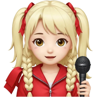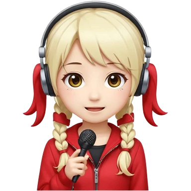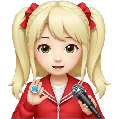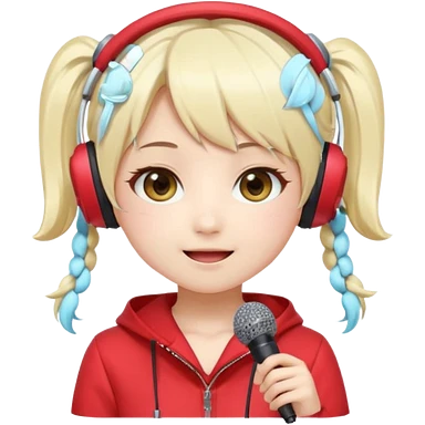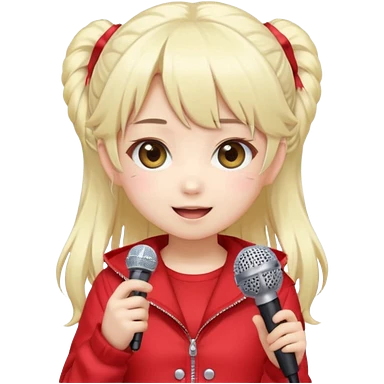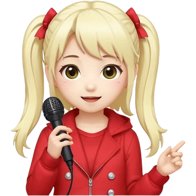 Cute kawaii emoji-style Japanese K-pop singer girl, long platinum blonde hair in twin tails, red outfit, holding a microphone, Japanese K-pop idol vibes, big sparkling eyes, chibi proportions, clean lineart, pastel colors, cheerful idol smile, sticker/emoji style, transparent background emoji
