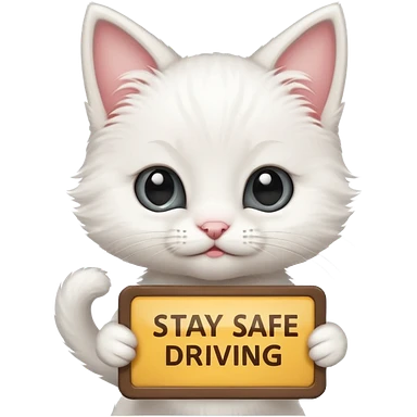 Cute White kitten with a sign that says, Stay safe driving! emoji