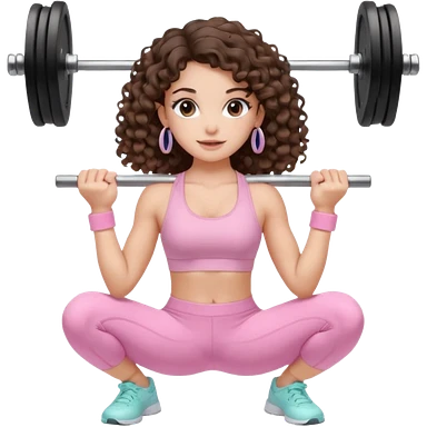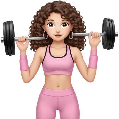 cute balayage brunette long hair curly/wavy haired girl, hoop earrings, clean girl makeup DOING EXERCISE with weights with a cute pastel pink set emoji