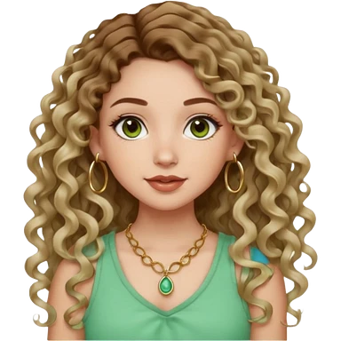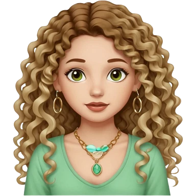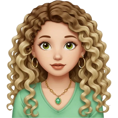 cute girl with not volominous VERY LONG curly/wavy balayage hair brown eyes full lips cute makeup cute necklace and hoop earrings white girl with light green top emoji