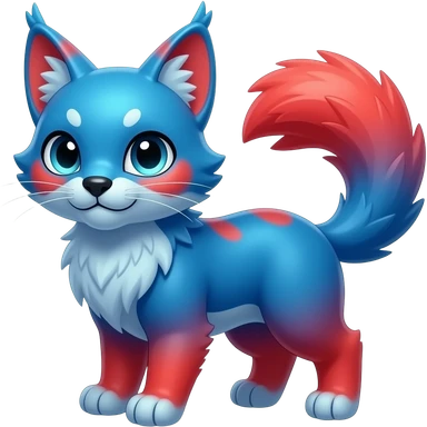 Cute kawaii cool edgy badass vibrant cyan-cobalt-blue-to-crimson-red gradient-colored iridescent glossy fur fantasy-caracal-civet-genet-sergal-vernid-Gryphon-Cacomistle-Trico-oncilla-animal-Fakémon-hybrid-fursona (full body), facial markings, (realism style) emoji