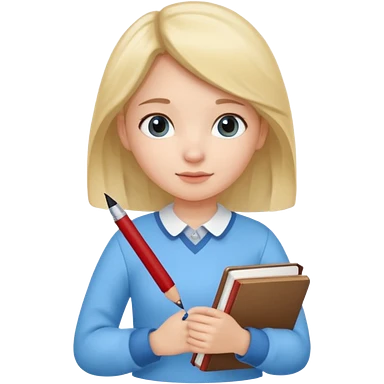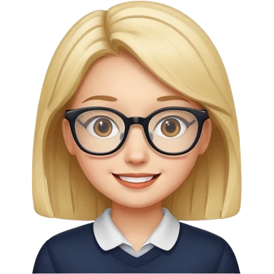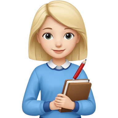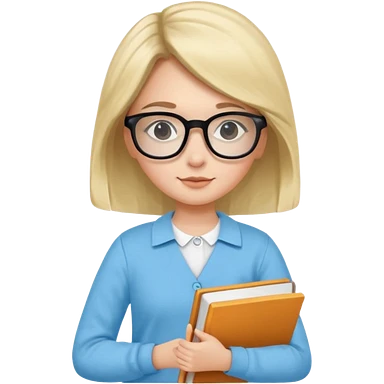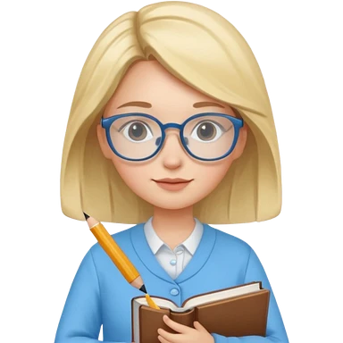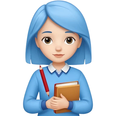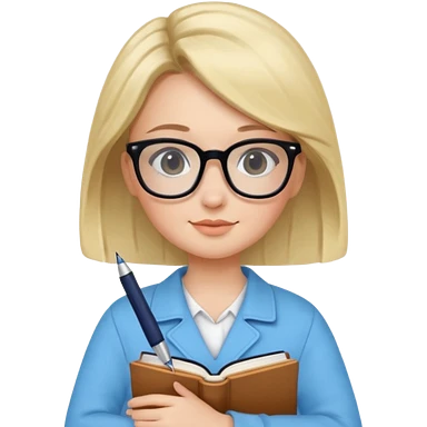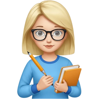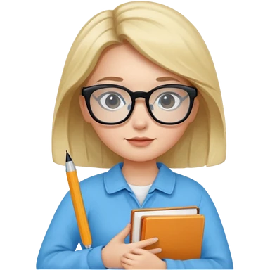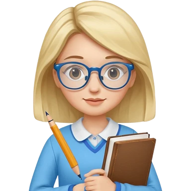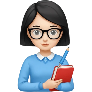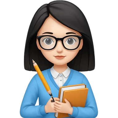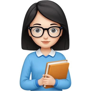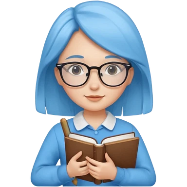 cute girl, glass, smart, Sky-blue colored clothing, holding a book in one arm and a pen in the other hand.Holding a pen in the right hand as if teaching.Wearing black glasses, with a smart and bright-looking face. emoji