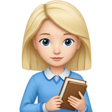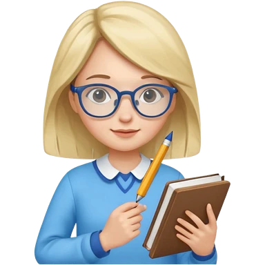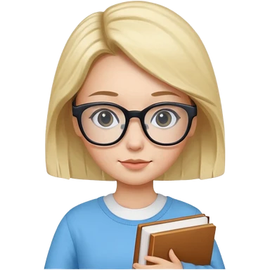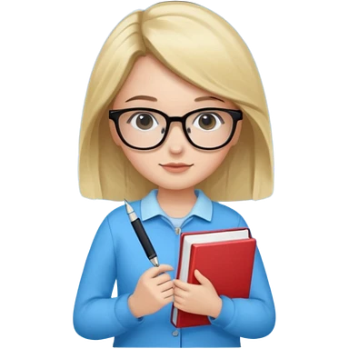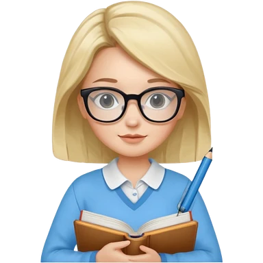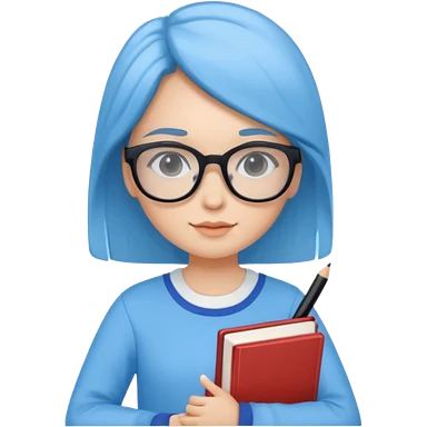 cute girl, glass, smart, Sky-blue colored clothing, holding a book in one arm and a pen in the other hand. emoji
