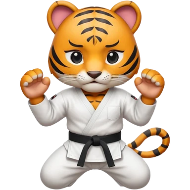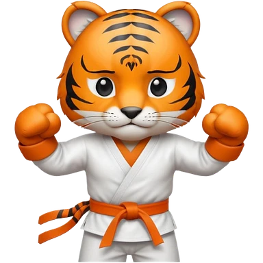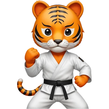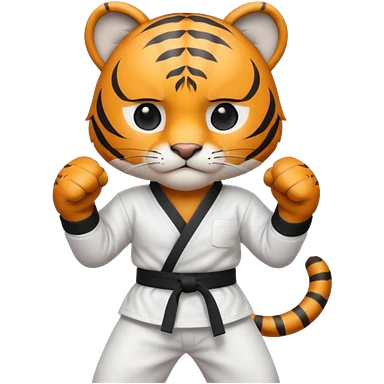 cute tiger doing karate portrait, head and shoulders only, wearing white gi uniform, black belt visible, fierce expression, 3D cartoon, mobile game icon style, clean background, no text, no watermark emoji