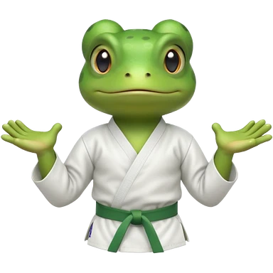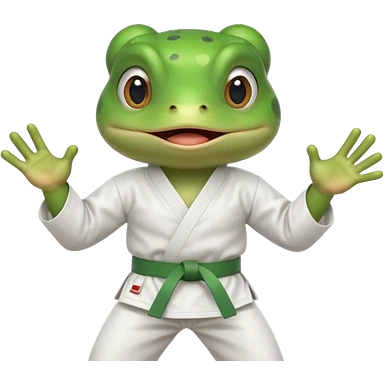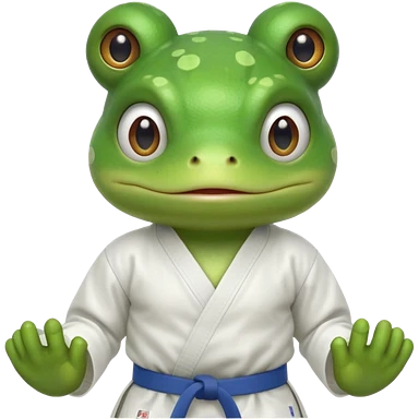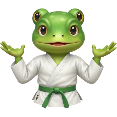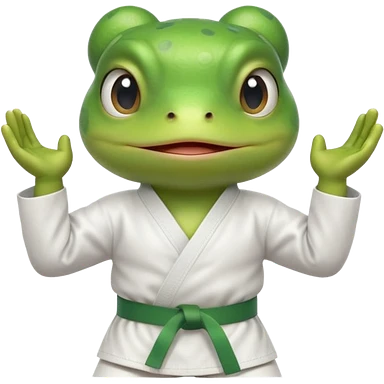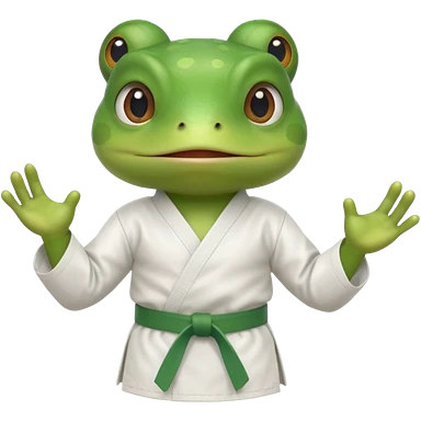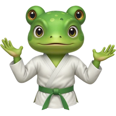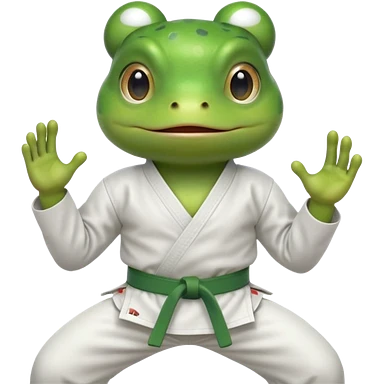 cute frog doing karate portrait, head and shoulders only, wearing white gi uniform, green belt visible, funny serious face, 3D cartoon, mobile game icon style, clean background, no text, no watermark emoji