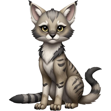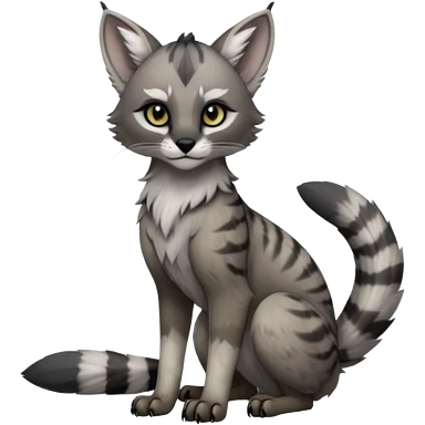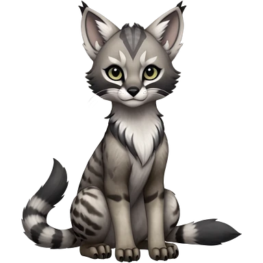 Cute kawaii cool edgy badass ashen grey fur with smoky charcoal ombré fade fantasy-caracal-civet-genet-sergal-vernid-Gryphon-Cacomistle-Trico-oncilla-animal-Fakémon-hybrid-fursona (full body), facial markings, (realism style) emoji