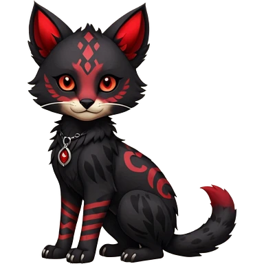 Cute accessorized kawaii cool edgy badass dark obsidian-black fur with crimson glowing runic markings fantasy-caracal-civet-genet-sergal-vernid-Gryphon-Cacomistle-Trico-oncilla-animal-Fakémon-hybrid-fursona (full body), facial markings, (realism style) emoji